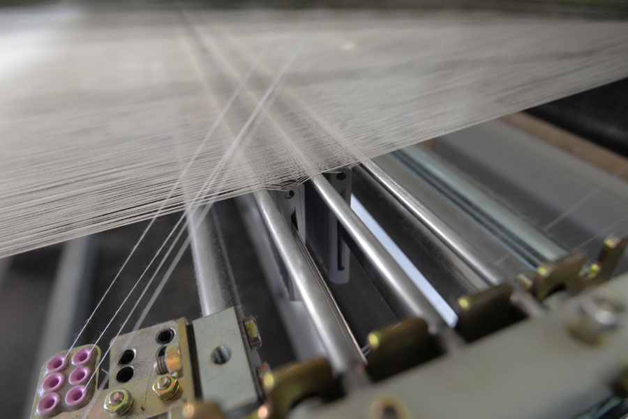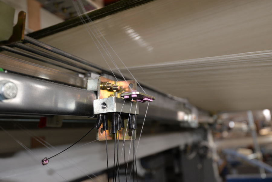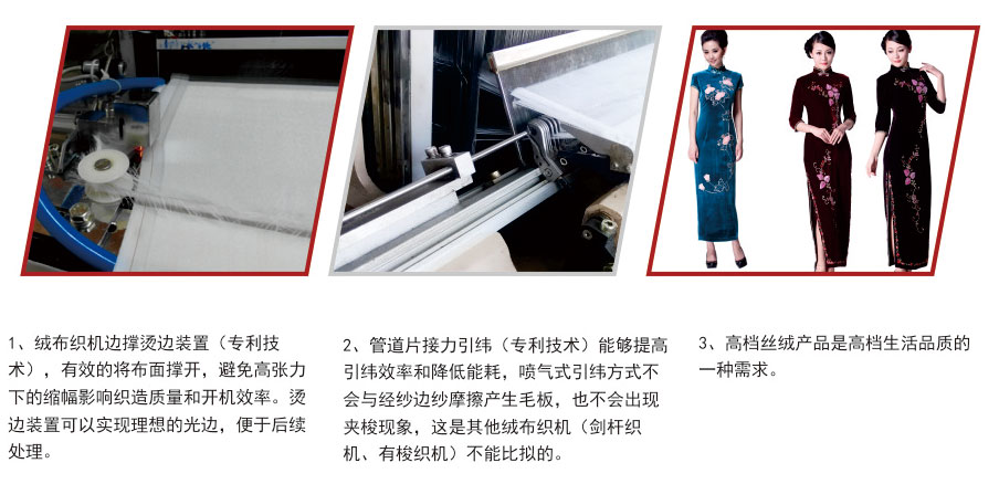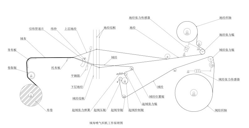 該產(chǎn)品可以織造經(jīng)起絨絨布組織要求的雙層布織物,上下兩層之間有一定高度的絨經(jīng),后經(jīng)過(guò)割絨機(jī)將其割開(kāi)形成兩塊絨布。該產(chǎn)品采用智能化絨布噴氣織機(jī)專用控制系統(tǒng),可以實(shí)現(xiàn)電子送經(jīng)(地經(jīng)、絨經(jīng)分別控制)、電子控制起絨、電子多臂開(kāi)口、電子控制管道片式噴氣引緯等功能,在織造過(guò)程中可以保持張力穩(wěn)定、絨高織造控制精確,采用噴氣式引緯方式不會(huì)與經(jīng)紗邊紗摩擦產(chǎn)生毛板,管道片接力引緯更能夠提高引為效率和降低能耗。
